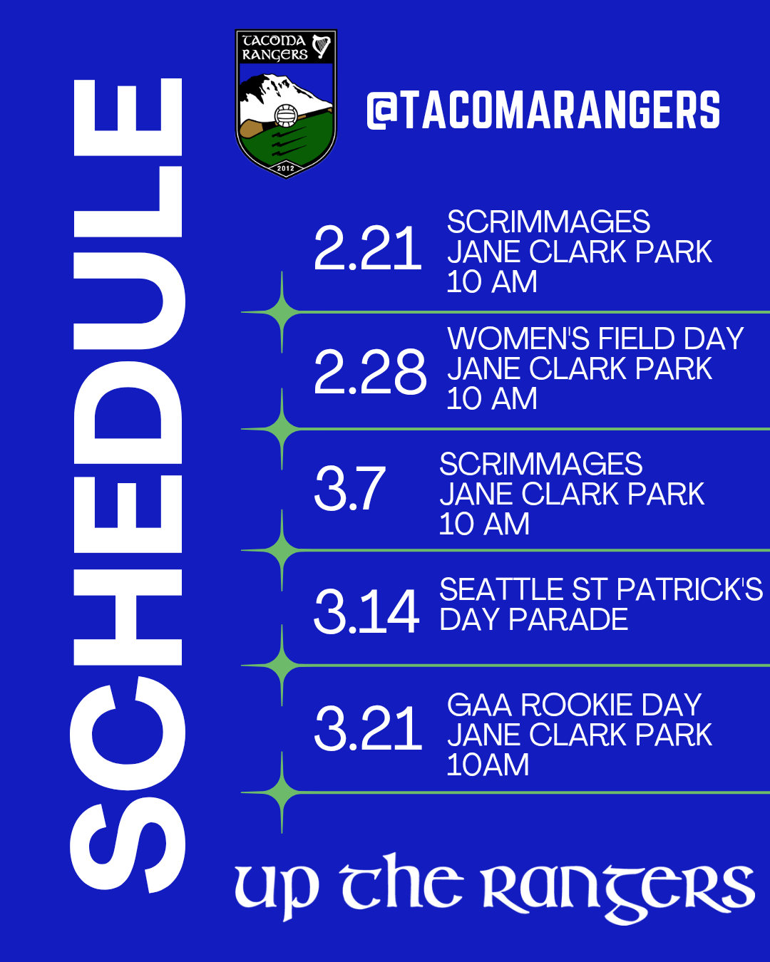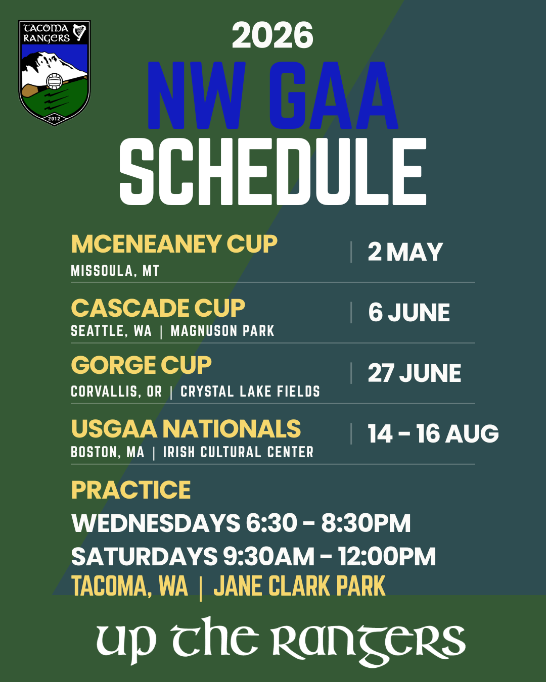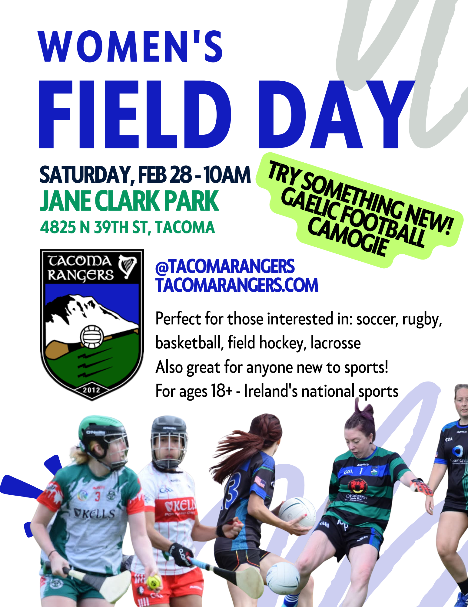 The Tacoma Rangers and its umbrella entity, The Irish Heritage Club, provide a social and sporting resource to promote Gaelic sports in the South Sound of the Pacific Northwest. The club maintains an active Gaelic Football and Hurling / Camogie program for men, women and youth. All are welcome to try out the sports, no previous experience is necessary.